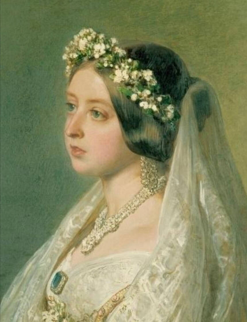 当现代新娘穿着洁白婚纱走向红毯时,很少有人知道这件礼服最初竟是欧洲贵族的“炫富神器”。1840年2月10日,20岁的维多利亚女王在伦敦白金汉宫举行婚礼,她拖着5.5米长的白色绸缎裙摆,头戴桃金娘花环,面纱上缀满价值1000英镑的霍尼顿蕾丝——这笔钱在当时能买下20栋伦敦豪宅。这场被媒体全程报道的婚礼,让白色婚纱从王室特权符号摇身变成全球新娘的梦想。 在此之前,欧洲新娘的礼服颜色堪称“彩虹派对”:法国贵族爱穿银红锦缎,英国平民多选深蓝色(方便婚后改做日常衣裙),甚至有新娘穿着条纹布嫁衣出嫁。白色礼服因布料娇贵、难以清洗,始终是顶级富豪的专属。维多利亚的曾祖母乔治三世的王后夏洛特,结婚时就穿着绣满金线的紫色天鹅绒礼服,裙摆镶着3000颗珍珠。而女王偏要反其道而行,不仅用纯白底色衬托蕾丝工艺,还特意雇佣200名工匠耗时8个月手工编织,这波操作与其说是婚礼着装,不如说是一场国家级的产业扶持直播。